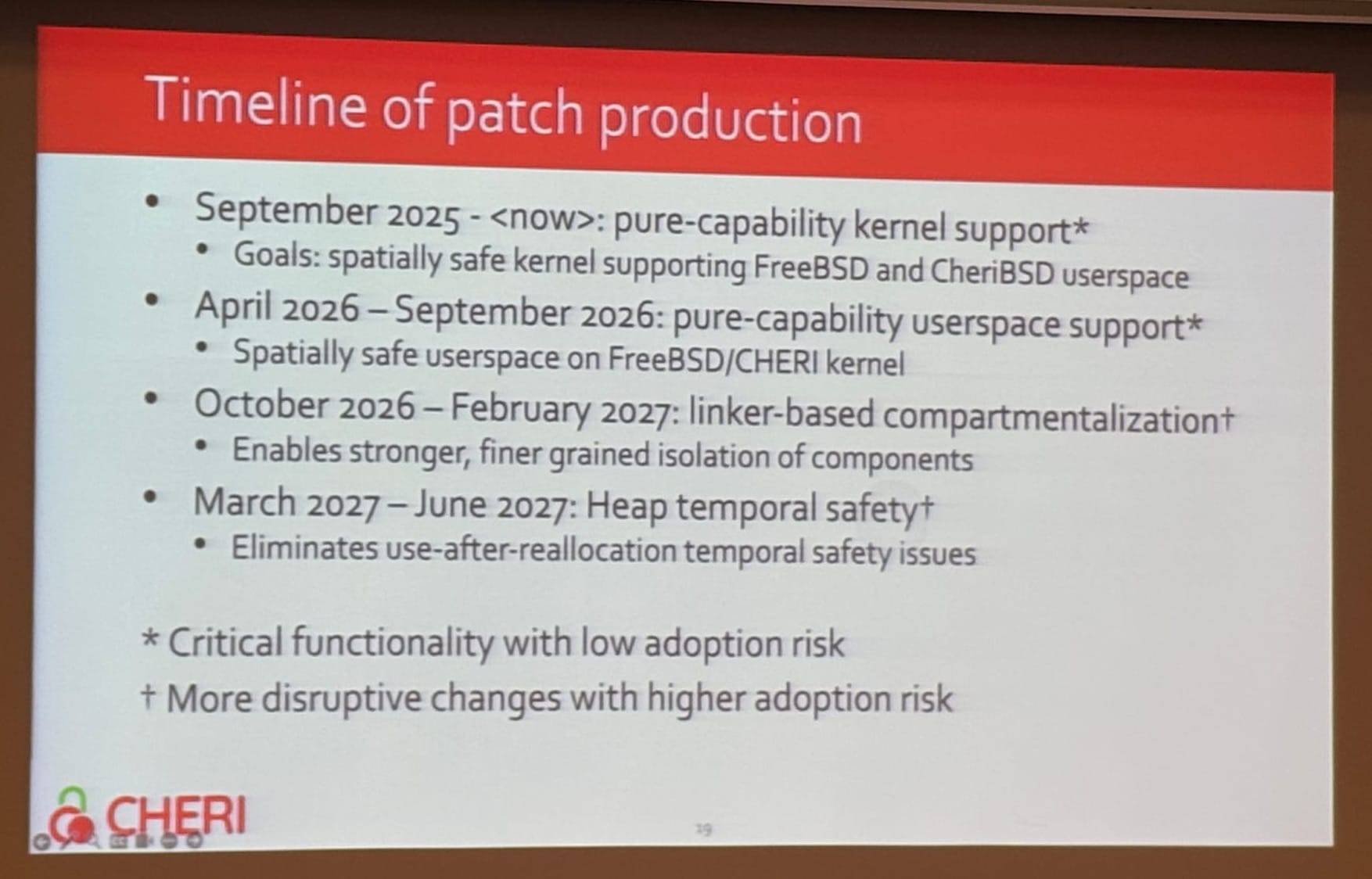 The upstreaming roadmap targets completion by FreeBSD 16, expected in December 2027. CheriBSD will be the first time-sharing operating system with full CHERI support, covering both Arm Morello and RISC-V CHERI (RV64Y). On the Linux side, a CHERI port is in progress, but organizational challenges — what I'd describe as significant process and priority shifts — appear to be slowing adoption.